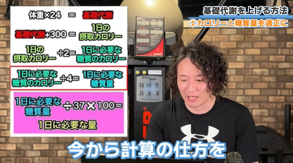 ◦ ÷ 2: 総カロリーの50%を炭水化物にするため