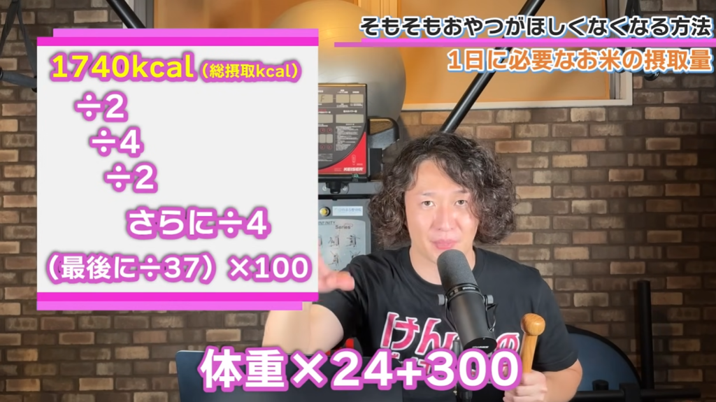 【お米の適正量・計算式】 (目標摂取カロリー ÷ 2 ÷ 4 ÷ 3.7) × 100
